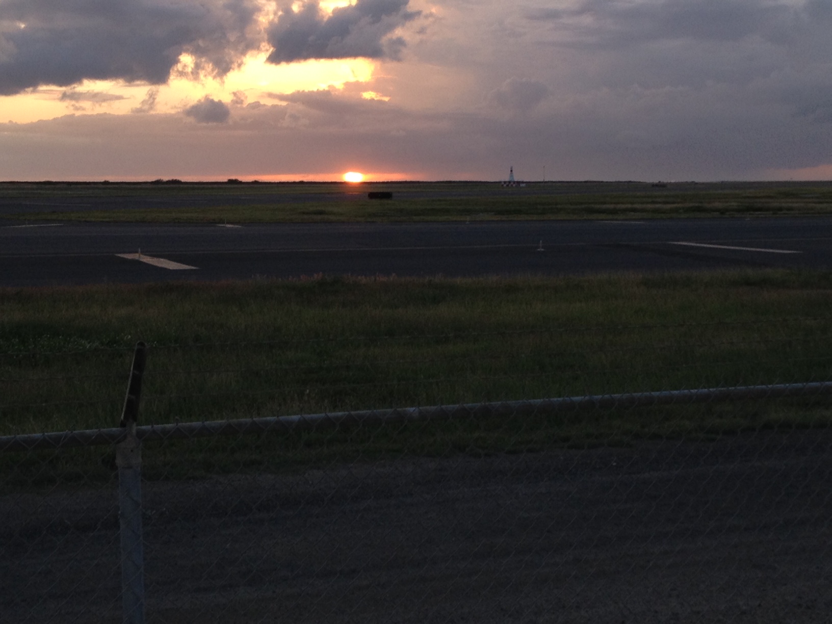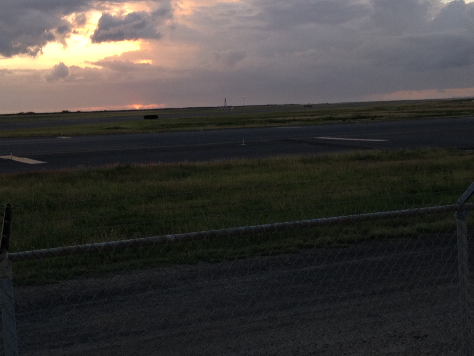 5:53 p.m. sunset occurs. Shortly beforehand, we pull into a parking lot near the lagoon beside the airport. Not a touristy spot, this lot has a view of cargo planes loading and an airfield surrounded by barb wire.