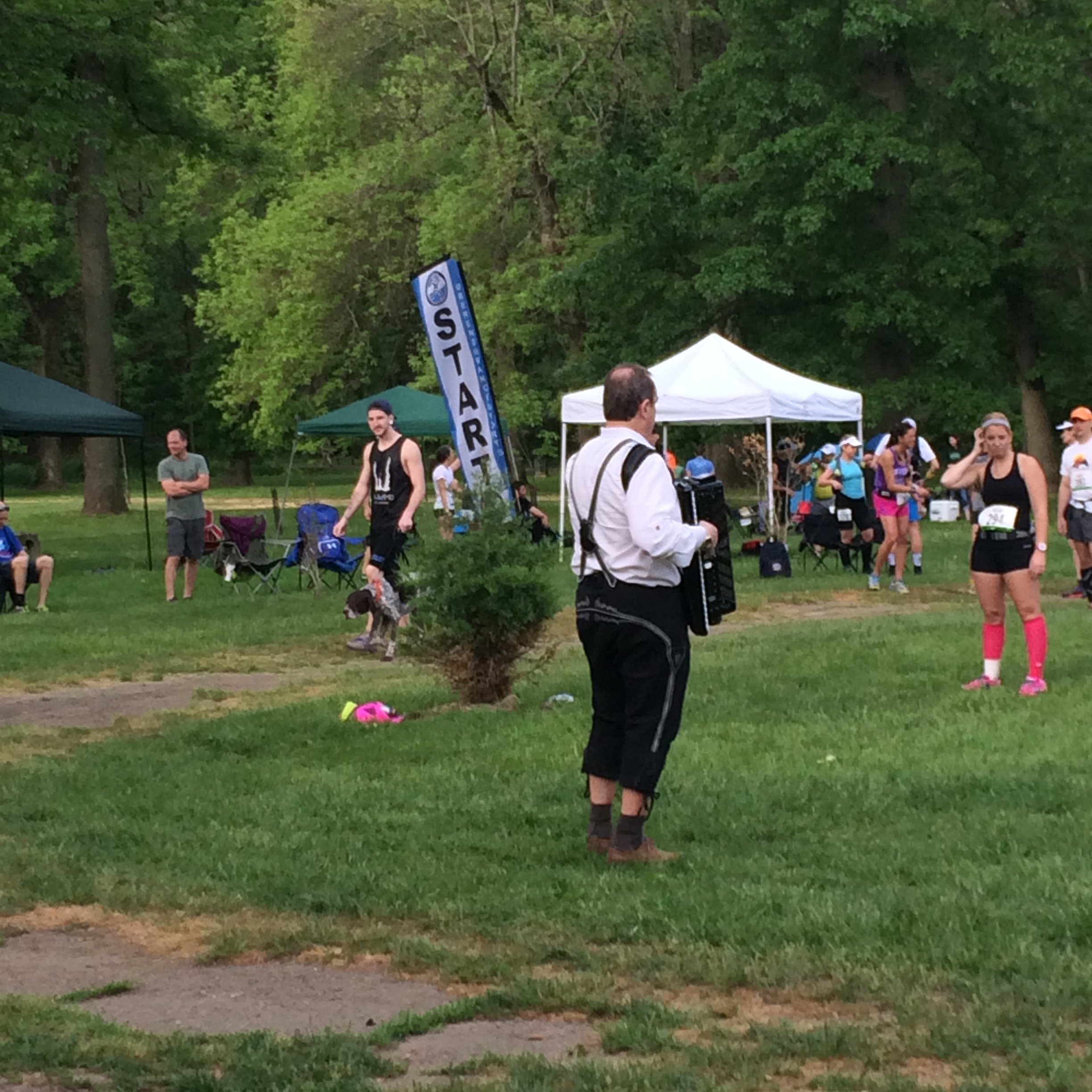 The course includes two creek crossings. I made it across the rocks, barely getting a toe wet. Making way through a flat single track switchback section I could hear the accordion and the start/finish activity. Beginning the second loop, it felt like luxury to run on those soft trail surfaces and listen to the creek bubble. There were enough other runners out there  to feel comfortable but also enough personal space to listen and watch nature unimpeded as my feet took me on this beautiful second loop tour.