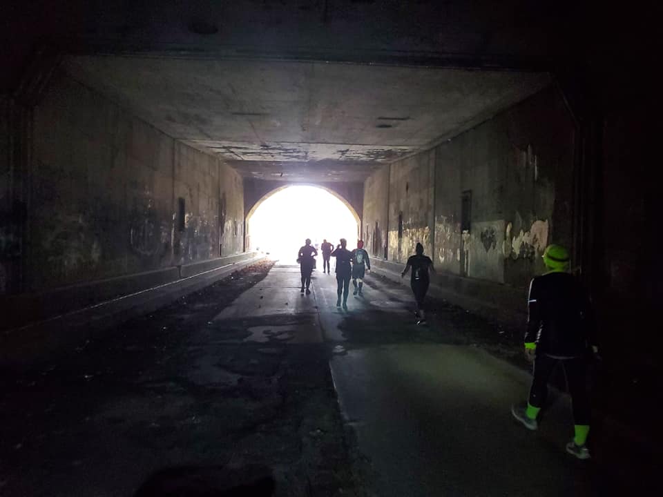Entering the tunnel, I saw bouncing beams of light in front of other runners, dancing off surfaces in the distance.