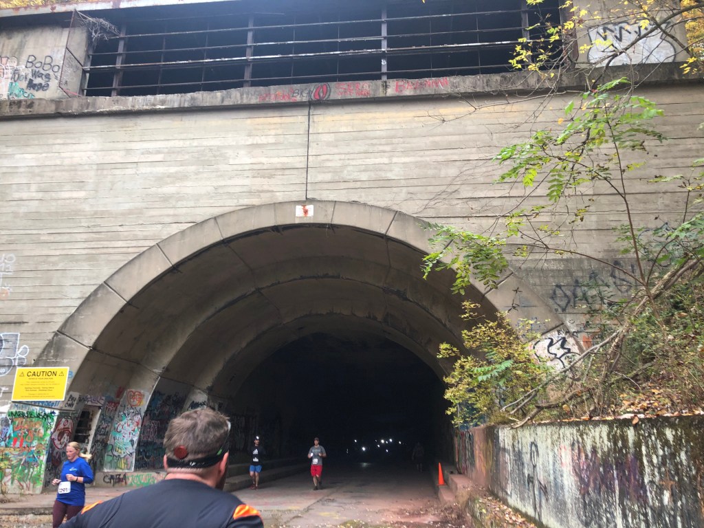 The course begins with a slight incline for less than a mile before entering the first of two tunnels. Did I mention that runners were required to bring a headlamp or flashlight? I was wearing a headlamp and as a failsafe wore my newly acquired nuckle lights.