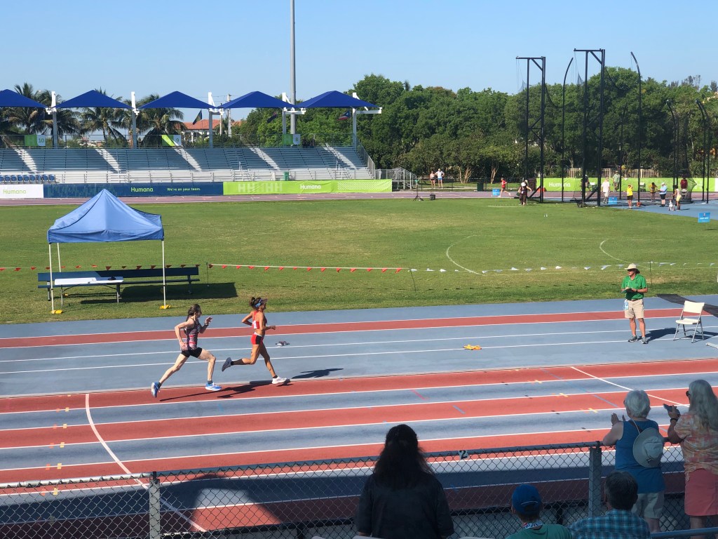 My finish here at Miramar gave me a third place. This is the best I have done in track so I returned to Fort Lauderdale a happy runner. First place in the 800 by a large margin was Susan Aderhold of Georgia who finished a good 34 seconds before anyone else in the field