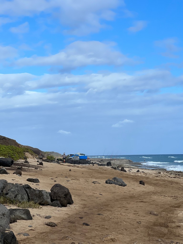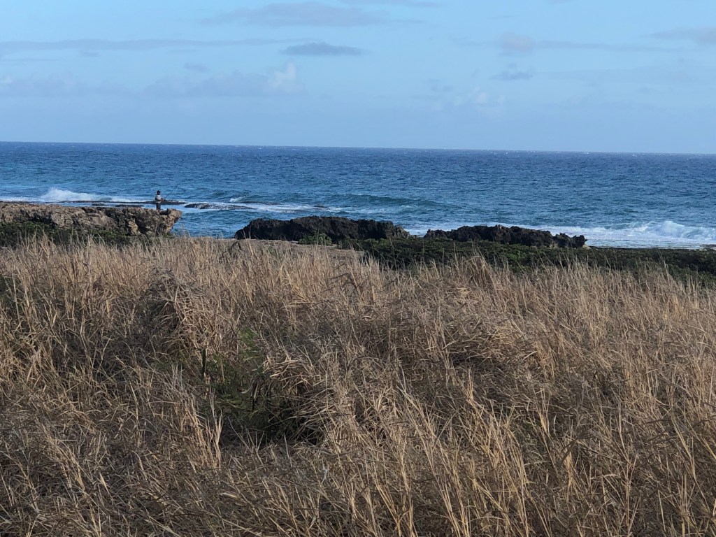 I agreed, but said I would do only half of the distance. I was seeing how rugged the terrain on the course is. Easily runnable but not an easy go overall. The out and back trail parallels the gorgeous ocean and follows jeep trails along the coast as well as an old sugar cane rail line. The actual point is the northernmost point on O’ahu Island. Nothing but Jeeps or the equivalent makes it back into this territory. Other than a family or two of hikers, fisherman ruled the coast.