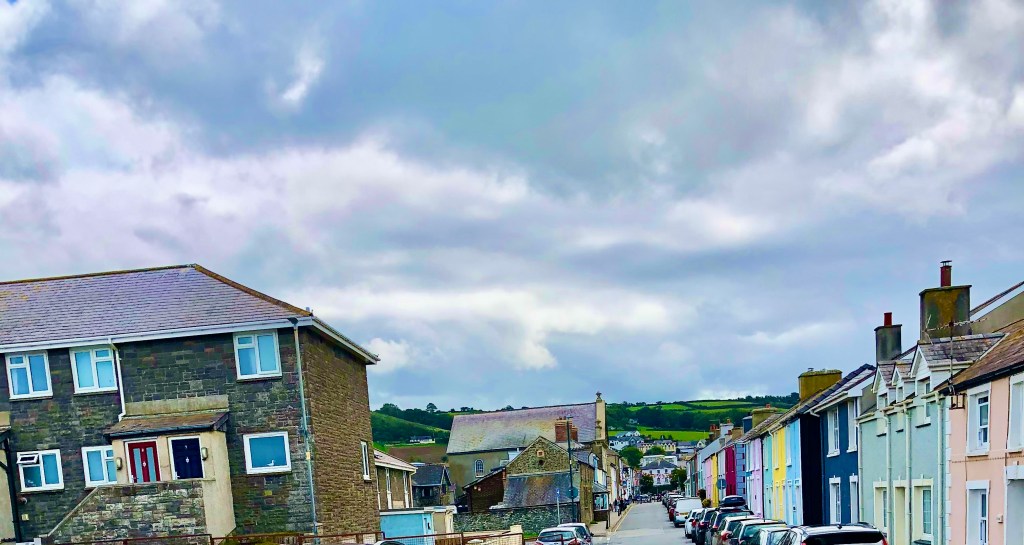 We found some benches and stopped to eat our bagged lunches in the village of Aberaeron with its colorful rows of houses. I also set a personal record for the smallest amount charged on a credit card, 30 pence for the pay toilets.
