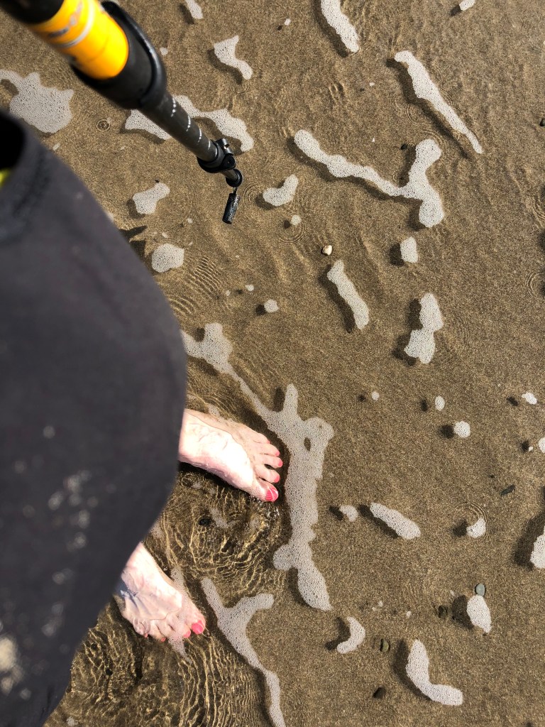 The final two miles of today’s hike bring us on beaches into New Quay. We remove our hiking boots and take to some pebbly areas down onto the sand and refresh our feet in the cold water of the bay..