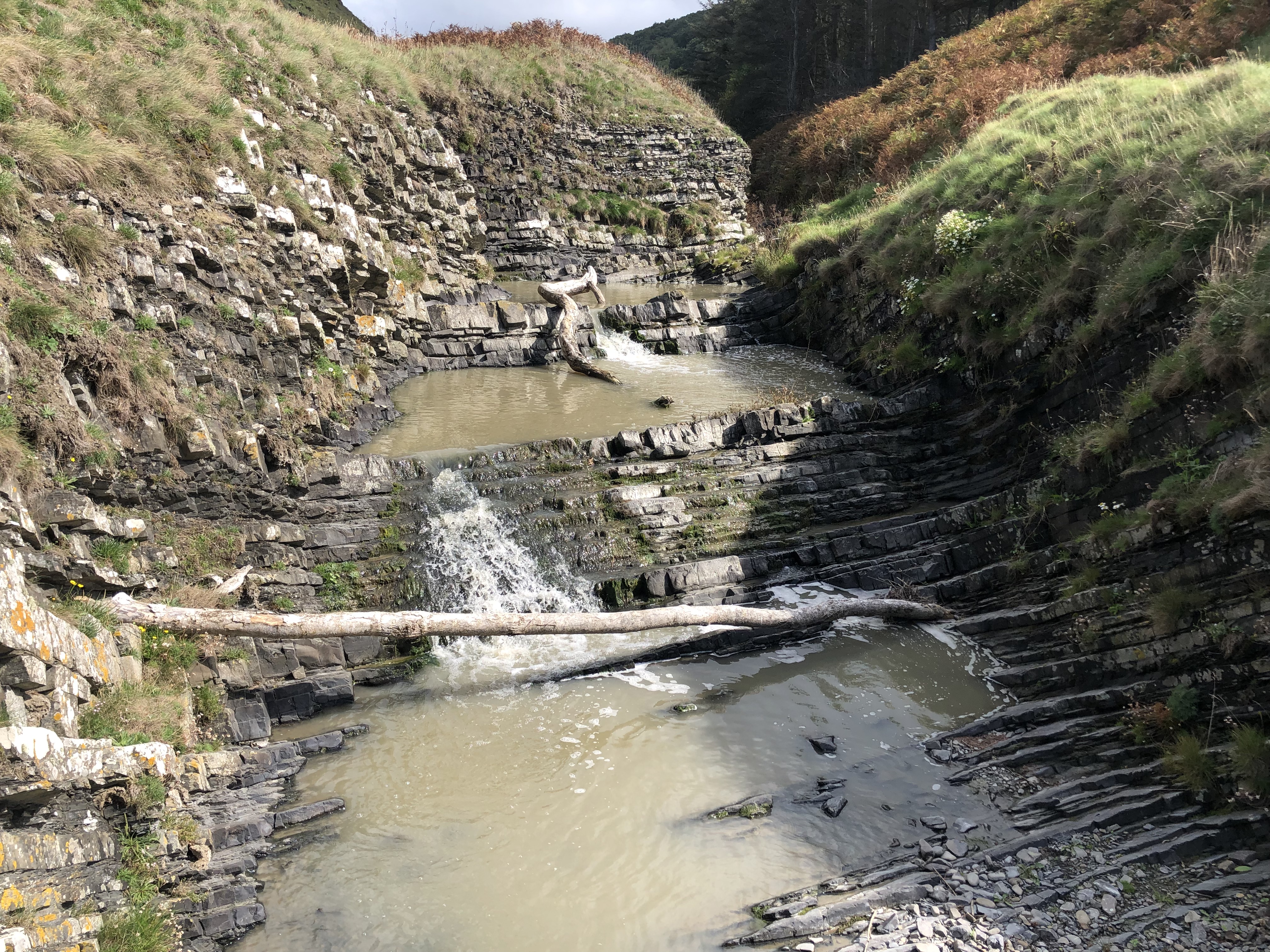We hike on past the nearly inaccessible Cwm Buwch beach where a waterfall plunges from the cliffs.