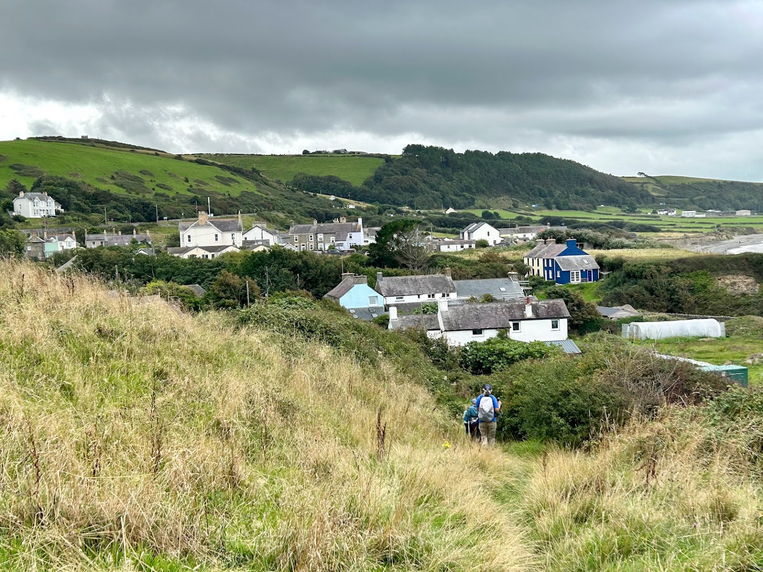 Soon enough, we are peering down at the beach in the village of Llangrannog. We make our way down the cliff and mingle with the vacationers.