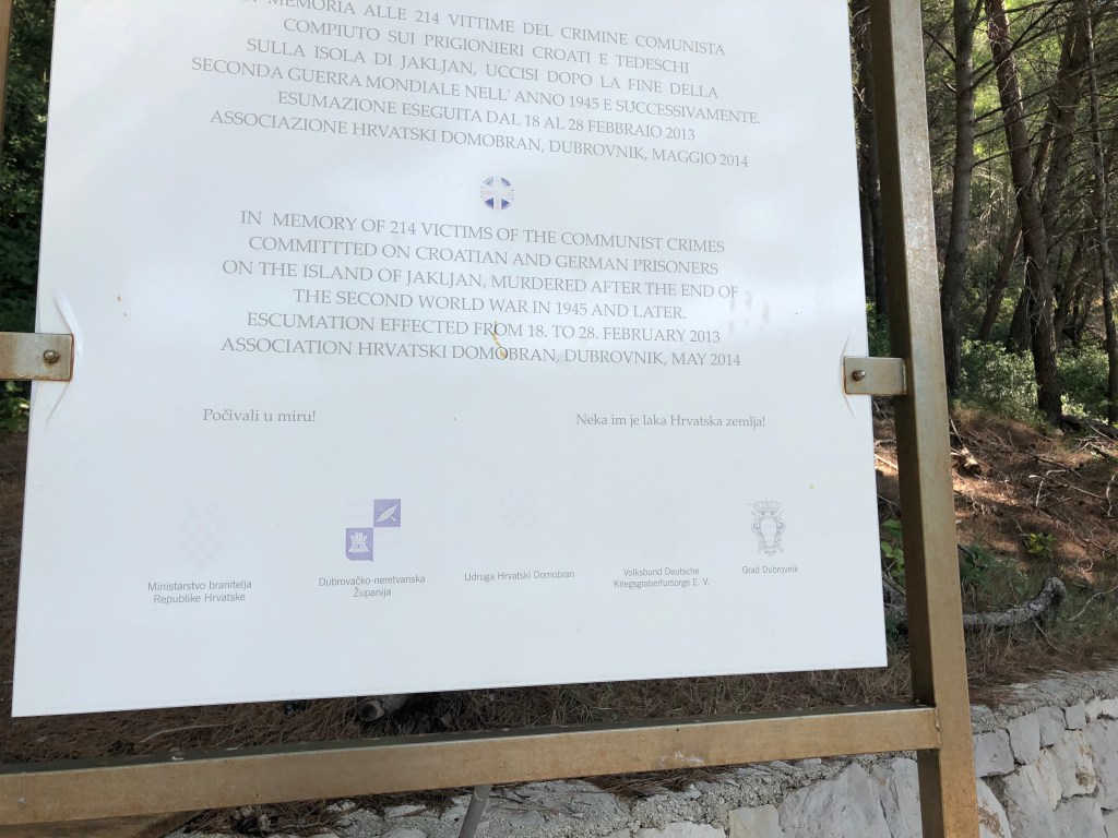 A monument and inscription near the harbor tell a somber tale of the year following WWII The English translation reads that Croatians and Germans on the island were murdered by the Communists. This Wikipedia article about Jakljan explains a bit more of this unsettling history.