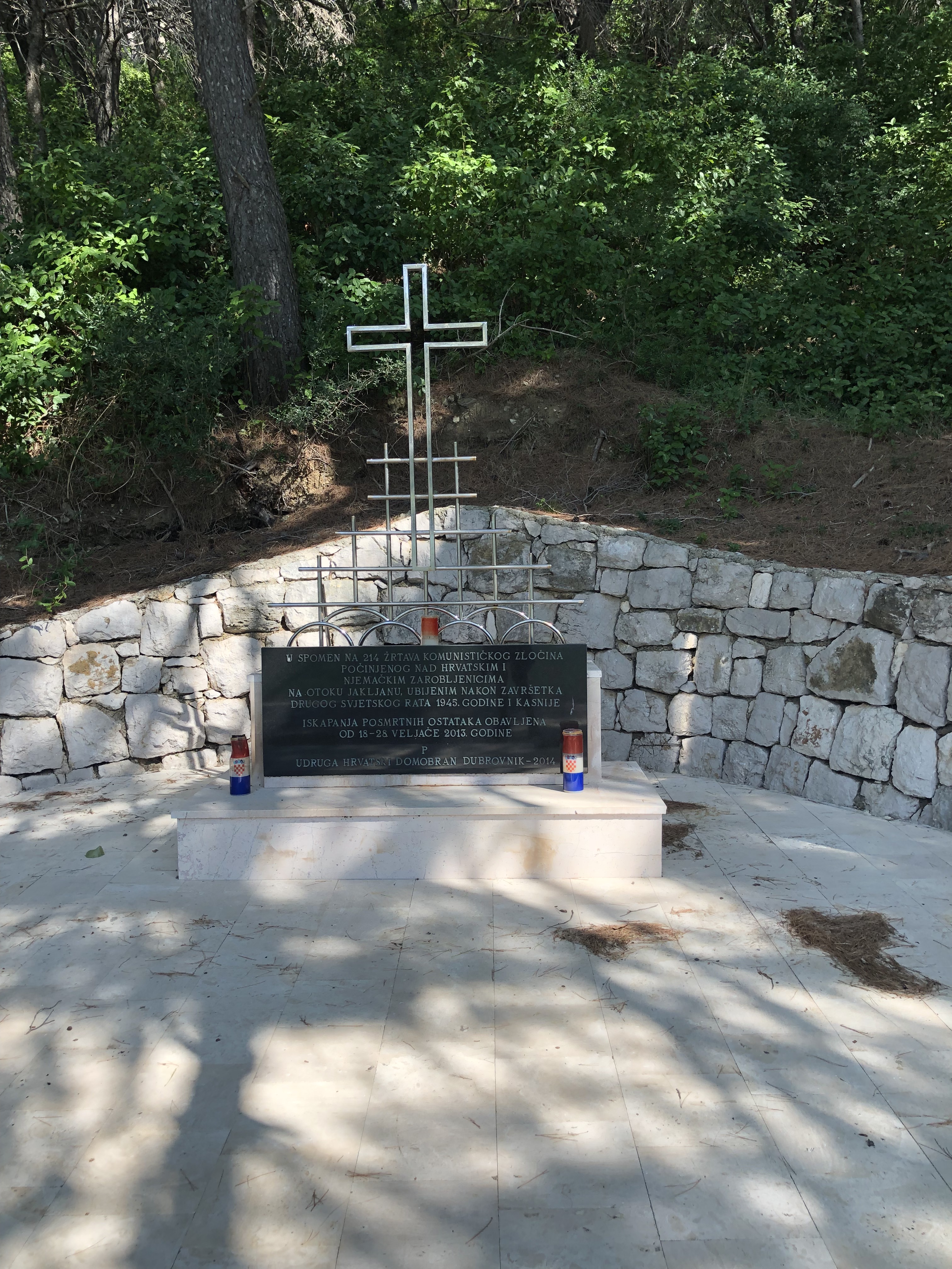 A monument and inscription near the harbor tell a somber tale of the year following WWII The English translation reads that Croatians and Germans on the island were murdered by the Communists. This Wikipedia article about Jakljan explains a bit more of this unsettling history.