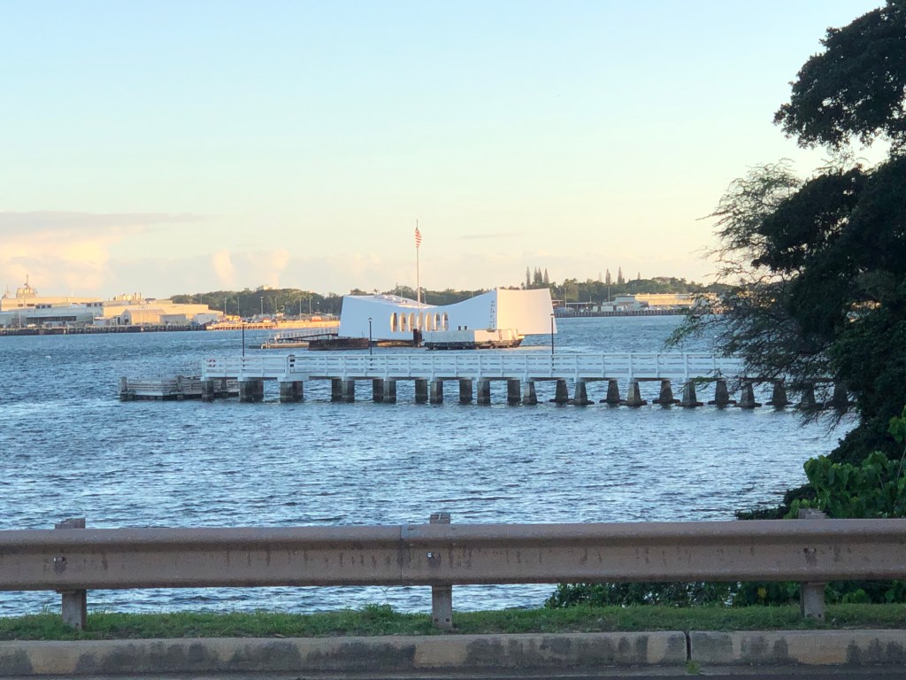 So with my driver’s license tucked in my shorts pocket, I was accompanied by my retired military walking companion, Alan, as we made our way through security. Walking across the bridge, there was a clear view of the USS Arizona Memorial in the harbor.