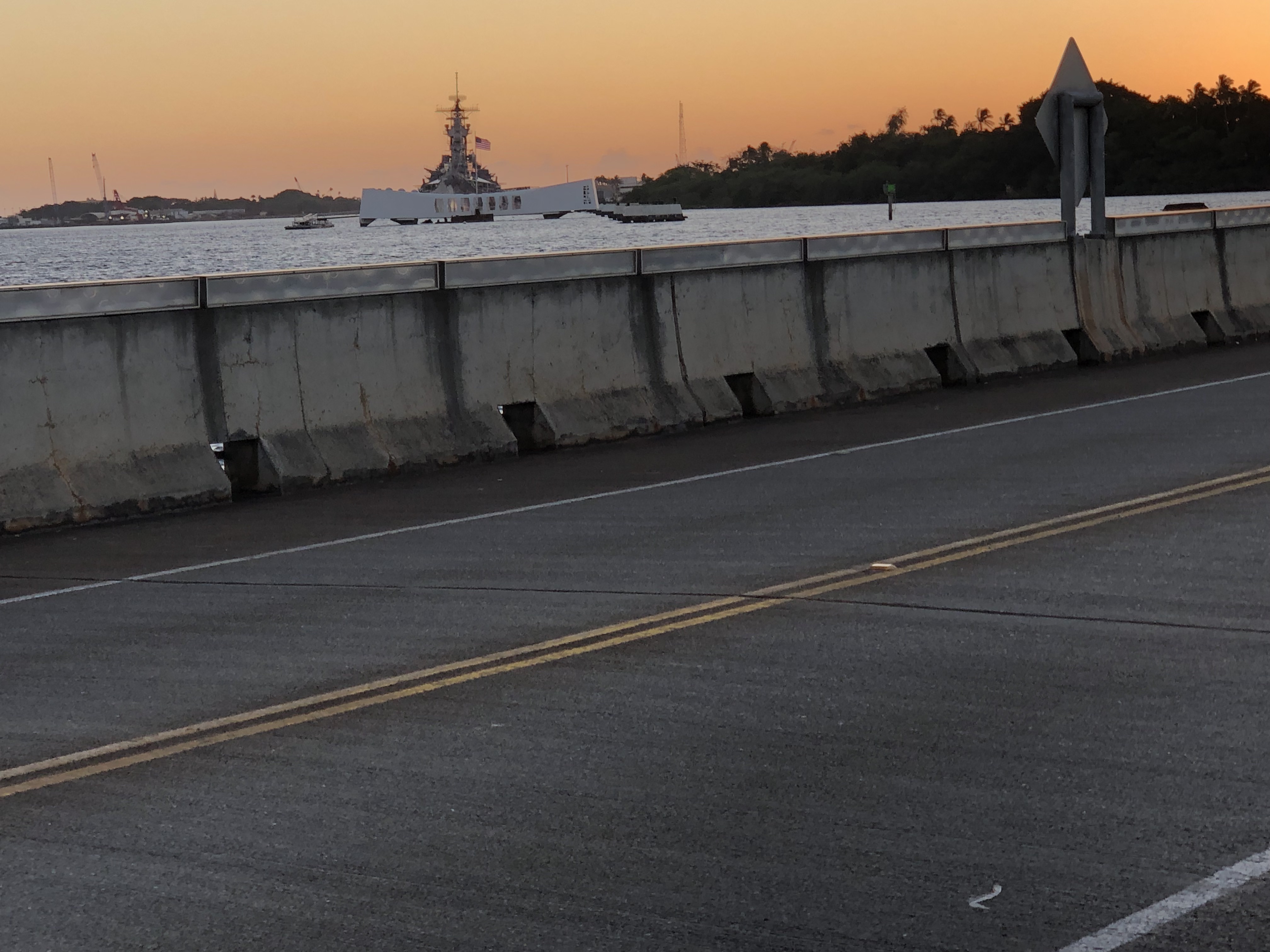 So with my driver’s license tucked in my shorts pocket, I was accompanied by my retired military walking companion, Alan, as we made our way through security. Walking across the bridge, there was a clear view of the USS Arizona Memorial in the harbor.