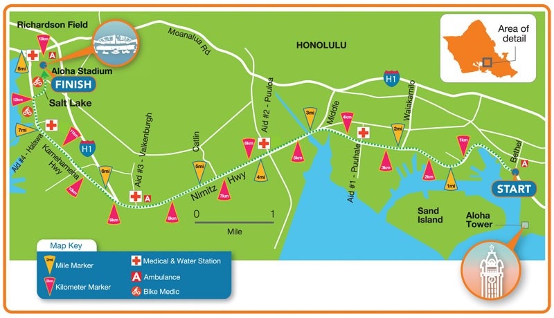 We stood for the National Anthem followed by a Hawaiian blessing, then we were off. The temperature was 79 degrees F, but felt much cooler with the trade winds coming off the ocean. You won’t see much in the way of photos of the course which runs down the Nimitz Highway, a fairly bland stretch of road in an otherwise beautiful Hawaii.
