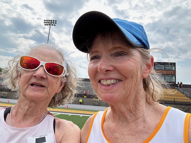 Still Sunday and several hours later, I ran the 1500. We ran this event with women from age 70 and up, although awards were done in 5-year age groups. I would much have preferred to be in the grandstand for this event to watch several brilliant runners tackling this distance.