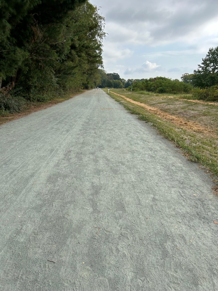 The middle mile included a short stint on a portion of the cross-country track used locally, then extended to a shaded asphalt out-and back path. The path section had a number of rutted areas (my New England friends would call these ‘road heaves’). Wanting to avoid returning home with skinned and bloody knees I slowed down my pace through the dappled shade and ruts. I picked it up again as I returned to that delightfuly-soft former horse track for the final mile.