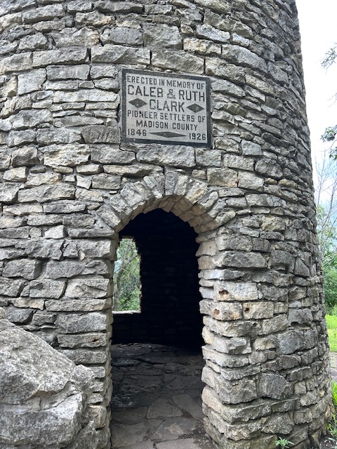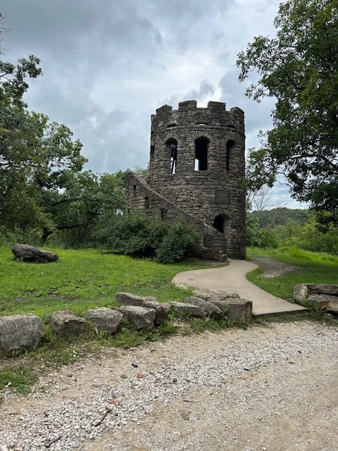 - City Park – While in the Winterset area, we stopped by this multi-use park. We took a 2-mile (out and back) hike with about 800 feet of elevation. This castle built by the descendants of a pioneering couple is a bit of a puzzle. Why a castle? As a granddaughter of pioneers, I can attest they were not the kind of folks who went in for castles. But, hey, it has a great view and a great show of admiration for previous generations.