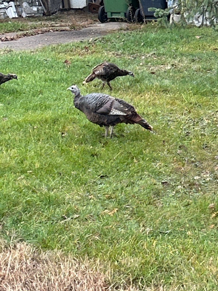 Returning near my start, I realize I’m a mile short of goal, so I do a short jaunt down a nearby lane. Here, I find a pond with a few lily pads remaining on the surface. a flock of wild turkeys to welcome my return and a nearby warning sign.